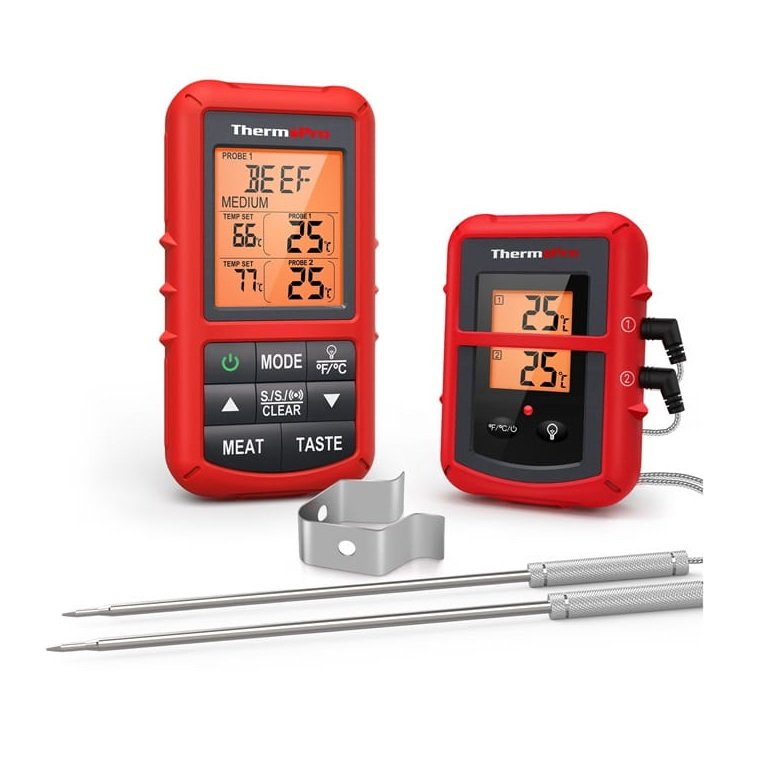 Możesz zabrać odbiornik do 150m od grilla czy wędzarni i zdalnie sprawdzać aktualną temperaturę i czas.